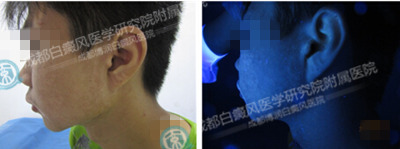 1、伍德灯检查:面部白斑色素脱失严重,边缘清晰;